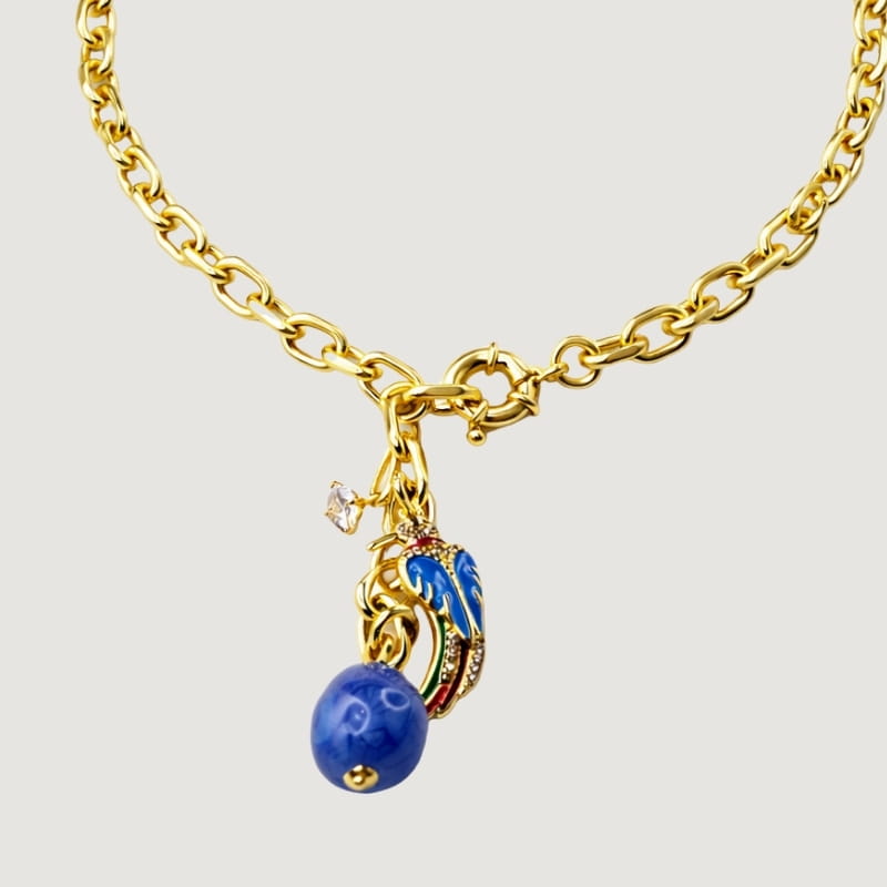 Алтан гургалдай нэртэй энэхүү доош унжсан чамин зүүлт нь эрх чөлөө, дэгжин байдал, аз хийморийг бэлгэдсэн утга агуулгатай. Гургалдай шувуу нь олон соёлд сайн мэдээ, шинэ эхлэл, эерэг энергийг илэрхийлдэг тул энэхүү зүүлт нь зүүсэн хүндээ урам зориг, гэрэл гэгээ авчирна. Өнгөлөг далавчны деталь болон унжсан чулууны хослол нь хөдөлгөөн бүрт зөөлөн савлаж, тансаг хэрнээ амьд мэдрэмж төрүүлнэ.